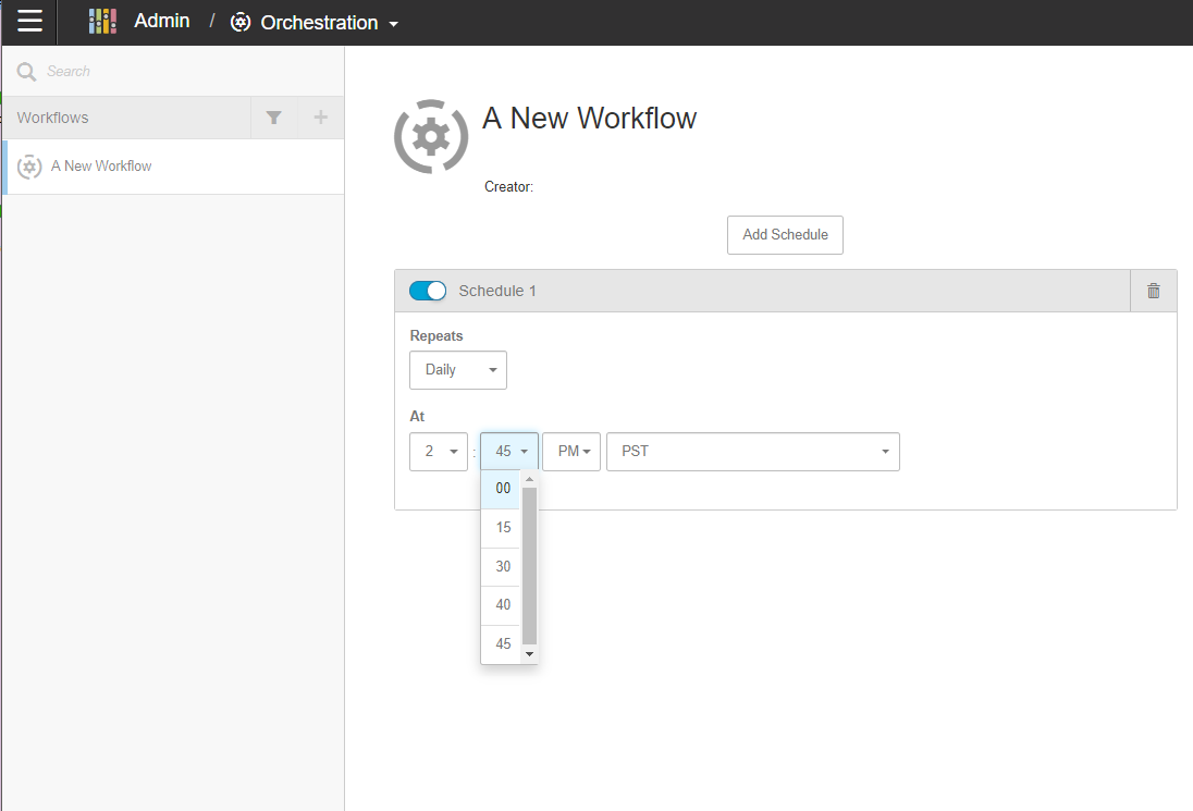 Scheduling a workflow From Orchestration, select your workflow from the Workflow list. Click Actions for your workflow. Select Scheduling from the Actions menu. Click Edit Schedules. Click Add Schedule. Select your repeat frequency, time, and time zone. Note: You must manually specify a time before saving the schedule. Note: Schedules can be toggled on or off by clicking the slider to the left of the schedule name. Click Save to finish.