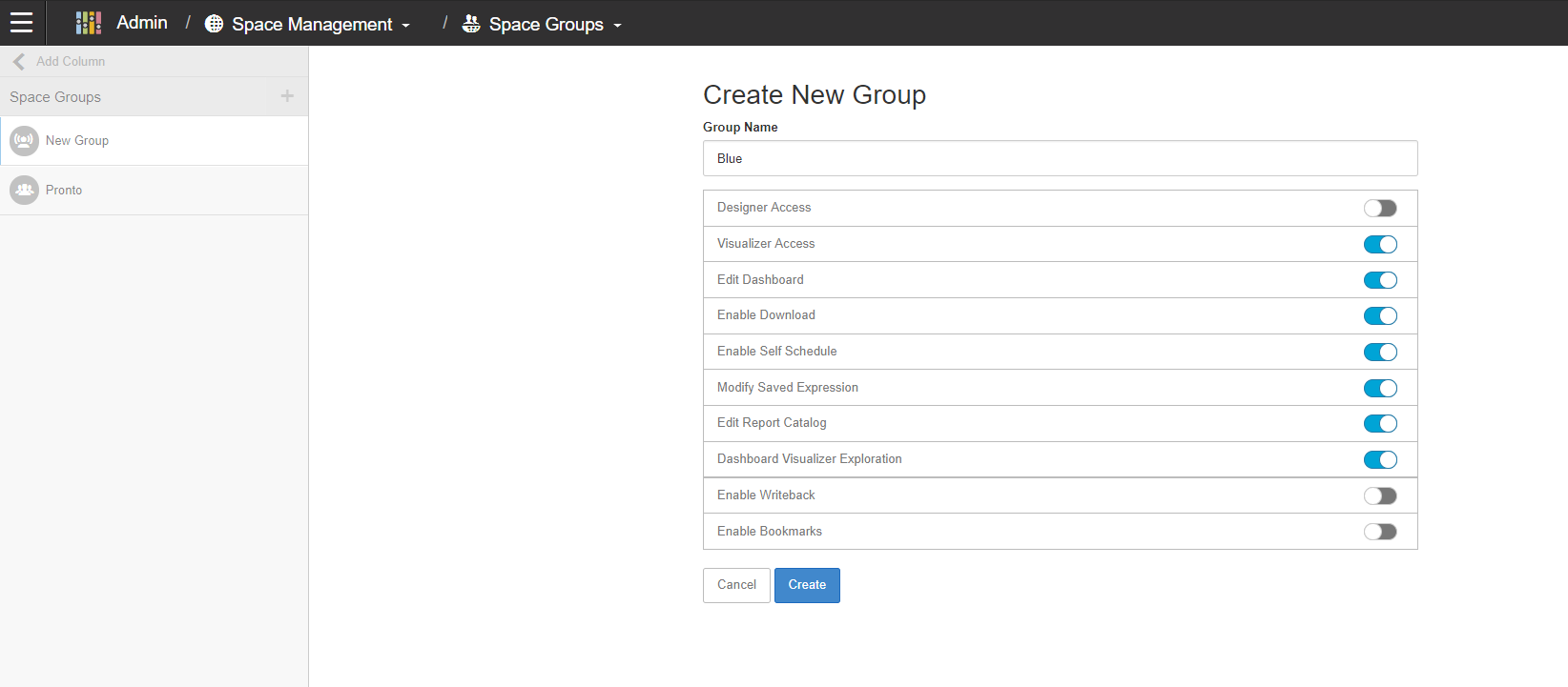 Creating a space group Select to Space Groups from Space Management. Click + to create a new space group. Specify a Group Name for the new space group, and then assign the permissions for that group. Click Create.