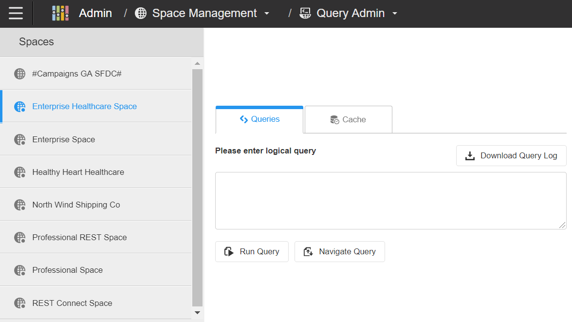 Space Administrators can test the SQL generation, query navigation plan, and query results of BQL queries from Query Admin.