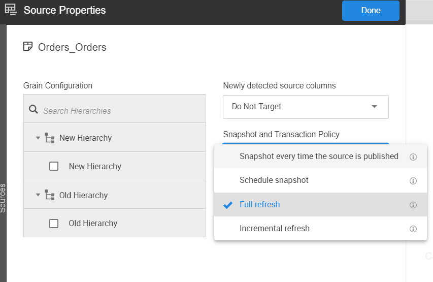 You can set various transaction and snapshot policy options for data sources. The different policy options have different effects on the physical queries. These policies apply to both raw data sources and scripted sources.