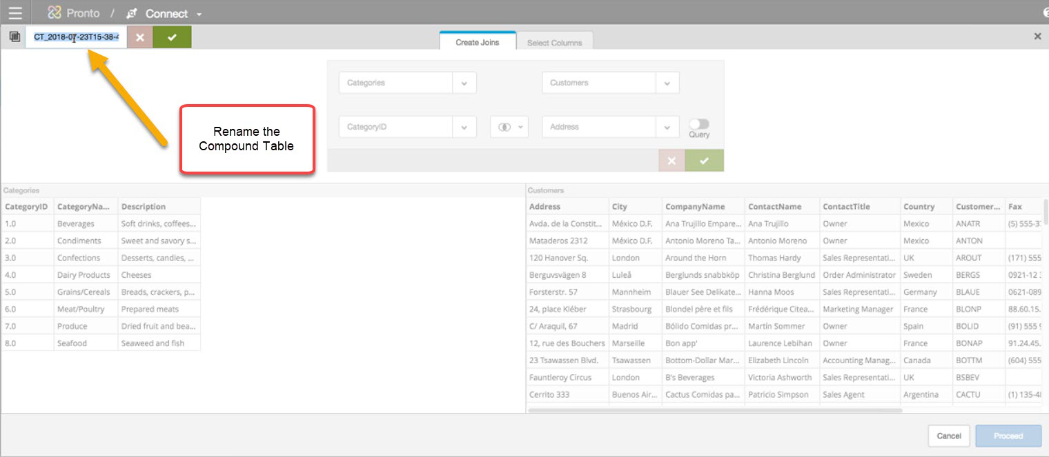 After creating the joins, you can click on Proceed or "Select Columns" to edit the columns you would like to include in your compound table, or click "Save" to have Birst automatically assemble the Compound Table with all columns from all joined tables included by default.