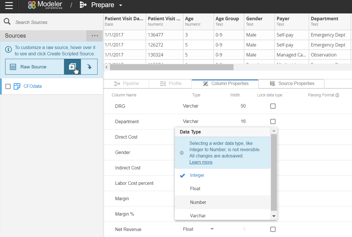 You can change a column's data type under Column Properties in Prepare. You are only able to change the data type to another relevant data type. For example, you can change a Date to a DateTime or Varchar, but not an Integer. Upcasting your data is not reversible. For example, if you change an Integer to Number, you would not be able to change the Number back to Integer.