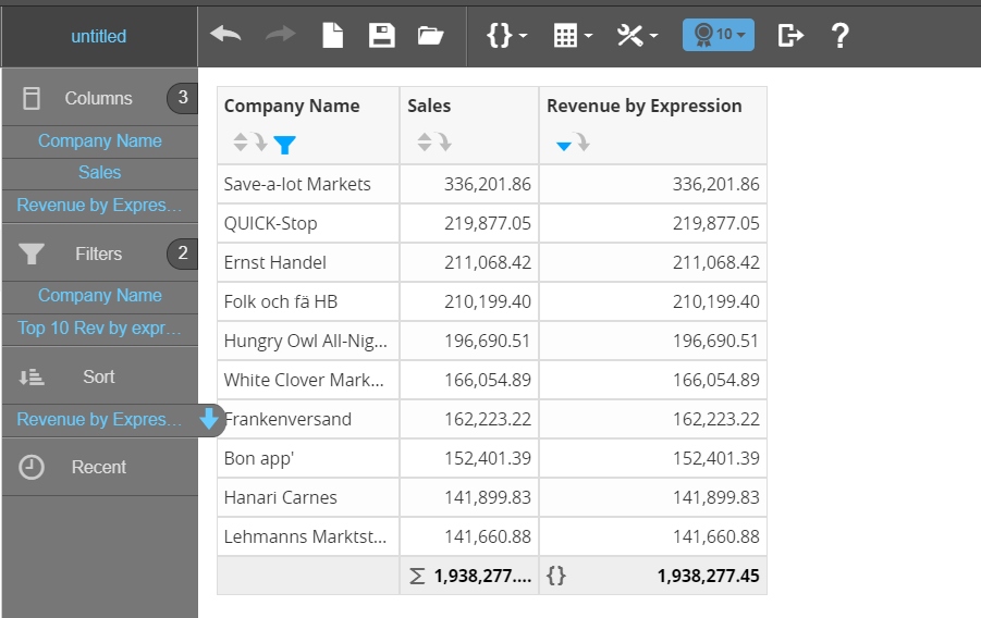 For example a report uses the custom set, based on the revenue defined by the custom expression, but now the results are identical to the report built using the custom measure, Sales (pre-aggregation). Lehman's is ranked 10th and Hanari Carnes returns to the result set. The measure values were also calculated identically this time because the expression was applied to every row of data in the database just like the sales custom measure.
