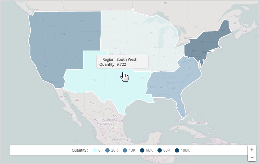 Applying a custom map to a geomap Select the attribute in Chart Builder to display its properties. Click Maps. Assign the custom map to the attribute. The geomap is updated. For example with quantity measure and the region attribute using the new US Regions geomap.