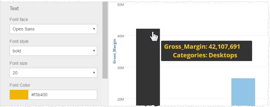 You can change the font style, units, suffix, decimal precision, and currency symbol used in tooltips.