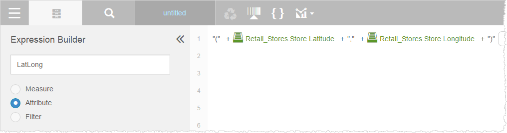 In Advanced mode:(((('(' + [Retail_Stores.Store Latitude]) + ',') + [Retail_Stores.Store Longitude]) + ')') - Click Save. The expression is listed in the Attributes list.