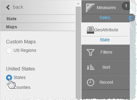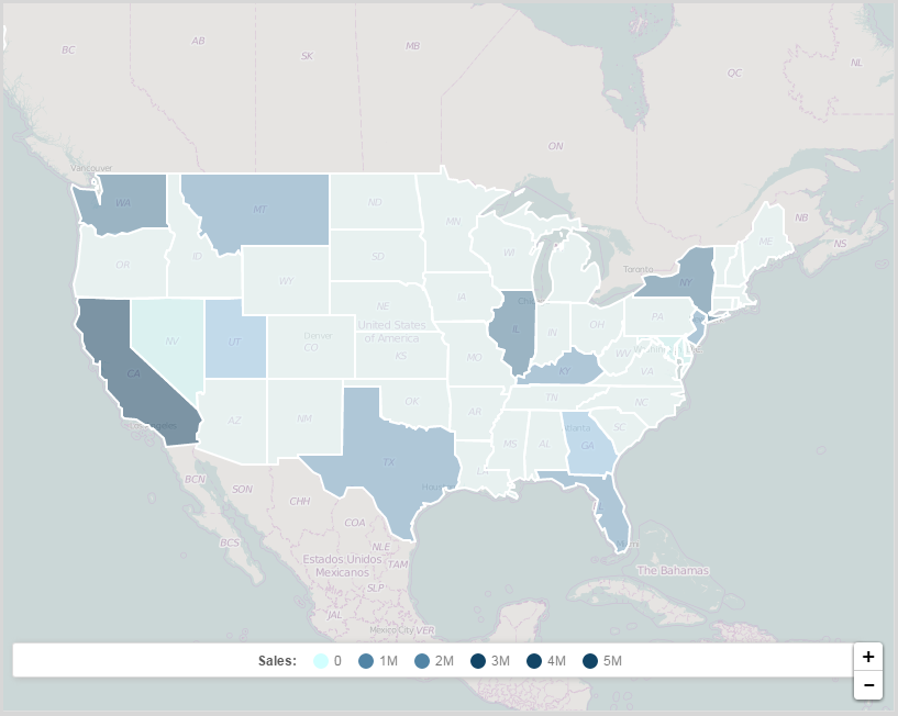 Visualizer Geomaps let you display data by geographic regions in a map format, for example Sales by State or Region.