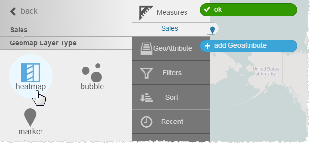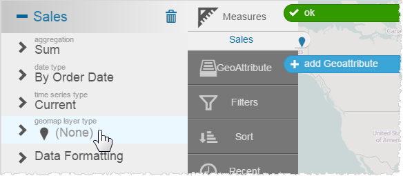 - Set the Geomap Layer Type for the Sales measure on the left pane.