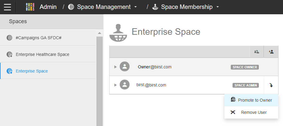 Select the user you would like to make the space owner, check the More Actions icon. Select to Promote to Owner. This will change the user to the Space Owner. The previous Space Owner will become a Space Admin.