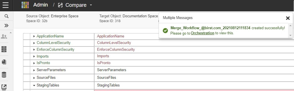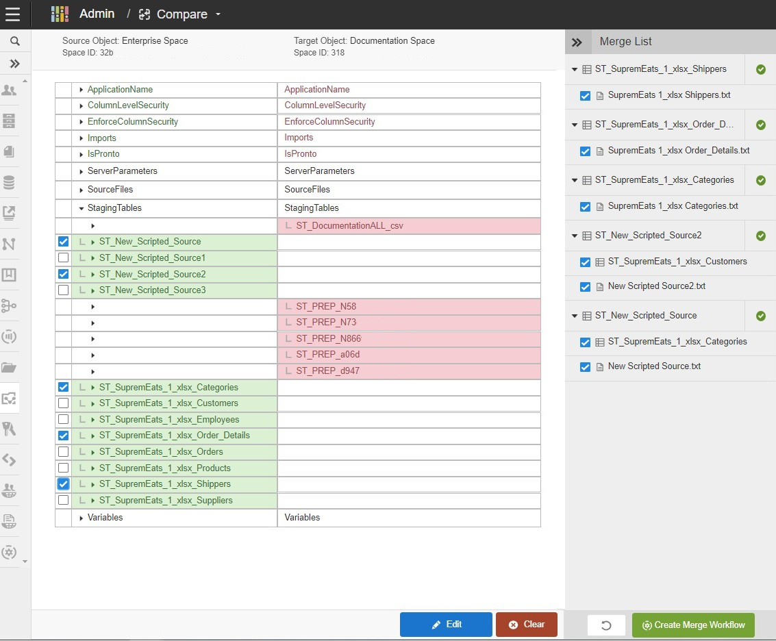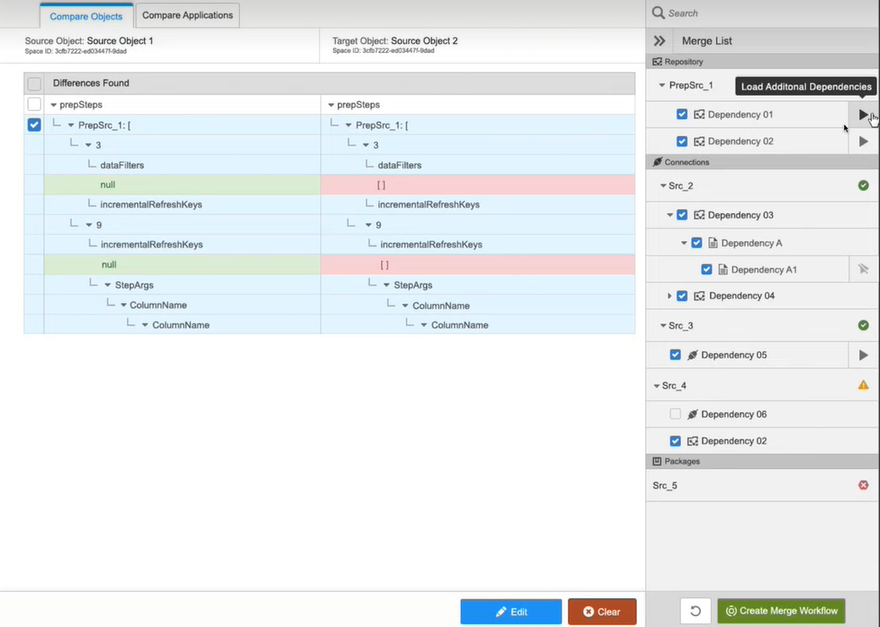 Note: The Merge option is only available for Sources and Hierarchies. Sources and Hierarchies are part of the Repository metadata type. You can merge Repository and Saved Expression objects targeting the same source and same target space selection in one merge workflow.