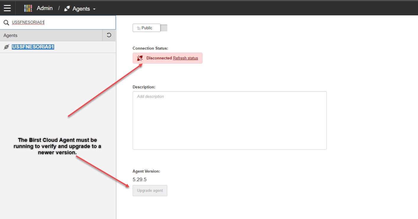 To upgrade your Birst Cloud Agent, you must start up your existing Birst Cloud Agent to verify the version and if desired to upgrade the version of the agent. In the following example, the Birst Cloud Agent is not running and cannot be upgraded.