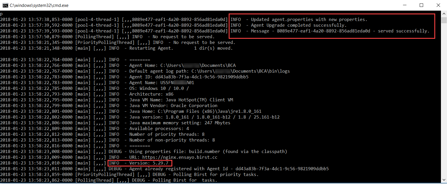 With the agent running, we verified the existing Agent version is 5.29.4. After the upgrade, you can verify that the agent is running the latest available agent by reviewing the Birst Cloud Agent log file as follows: