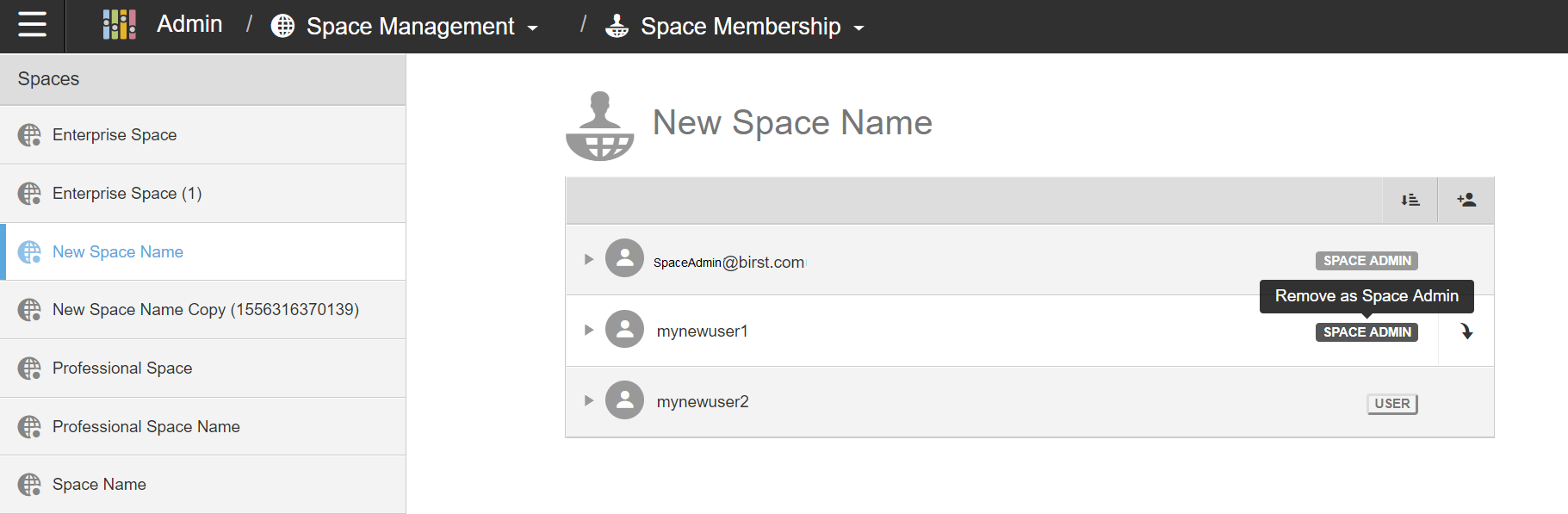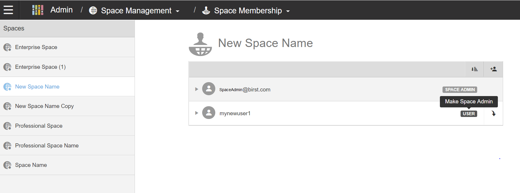 If you want to promote a user to a Space Administrator, check the User button next to the user's name. The button should now say Space Admin.