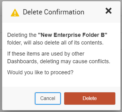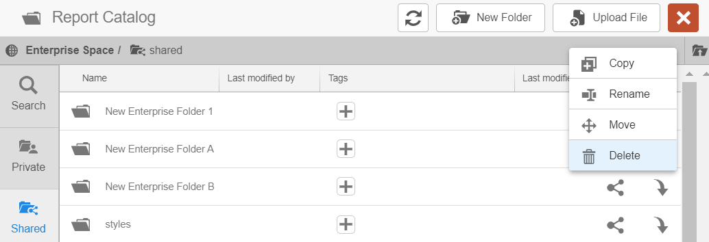 Deleting files or folders Select the files or folders to delete from the Report Catalog. Click the Actions icon to view more options. Select Delete. Click Delete on the confirmation message. Alternatively, click Cancel to cancel deleting the file or folder. Caution: Deleting an object is permanent and cannot be undone.