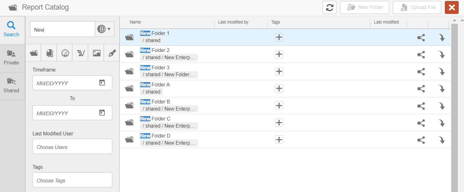- Click the folder, collection, Dashboard, Visualizer, image, or Designer icons below the main search bar to filter by type.