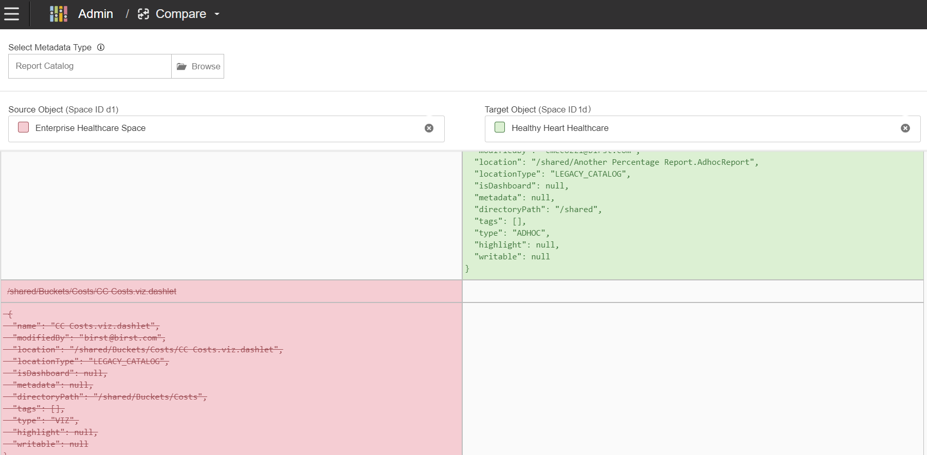 The results will show the differences between the source object and target object for that metadata type. Items removed from the target object will display on the left in red with strikethrough text. Items added to the target will display on the right in green.