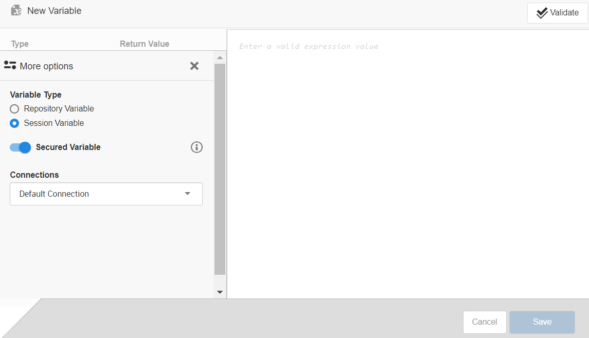 Optionally, you can click the More Options icon to select a Variable Type and define Connections for the variable on the More Options panel.- Variable Type