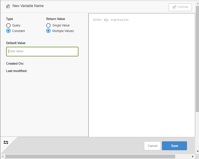 - Query: Query-based variables are assigned the first column of the first row result of a BQL query. A query variable definition is a BQL expression. It can return one or multiple values.