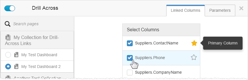 Optionally, for charts and tables, you can set a column as the Primary Column to pass the value of the column to the linked dashboard. The Primary Column value are always passed. Select the Primary Column and optionally check additional columns to pass additional values.