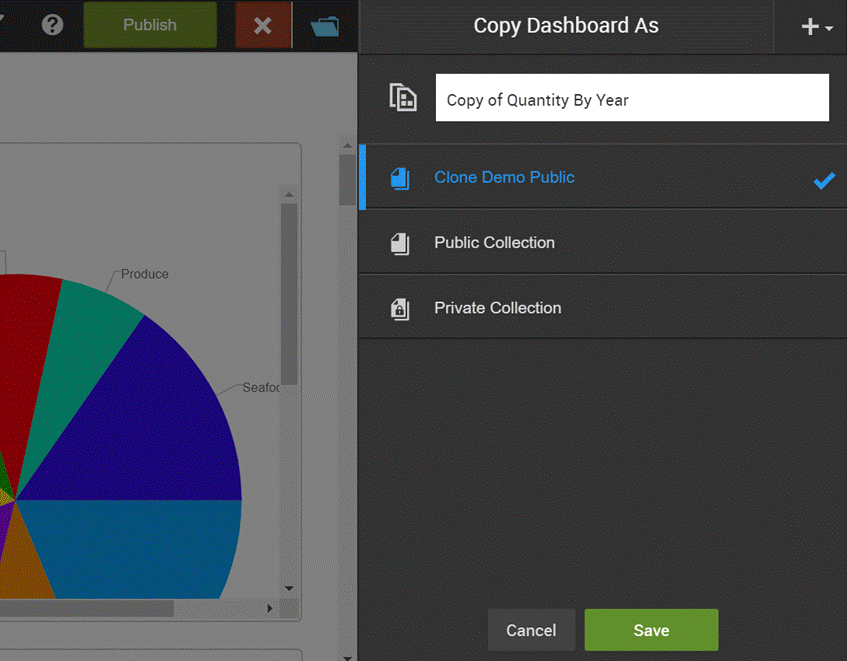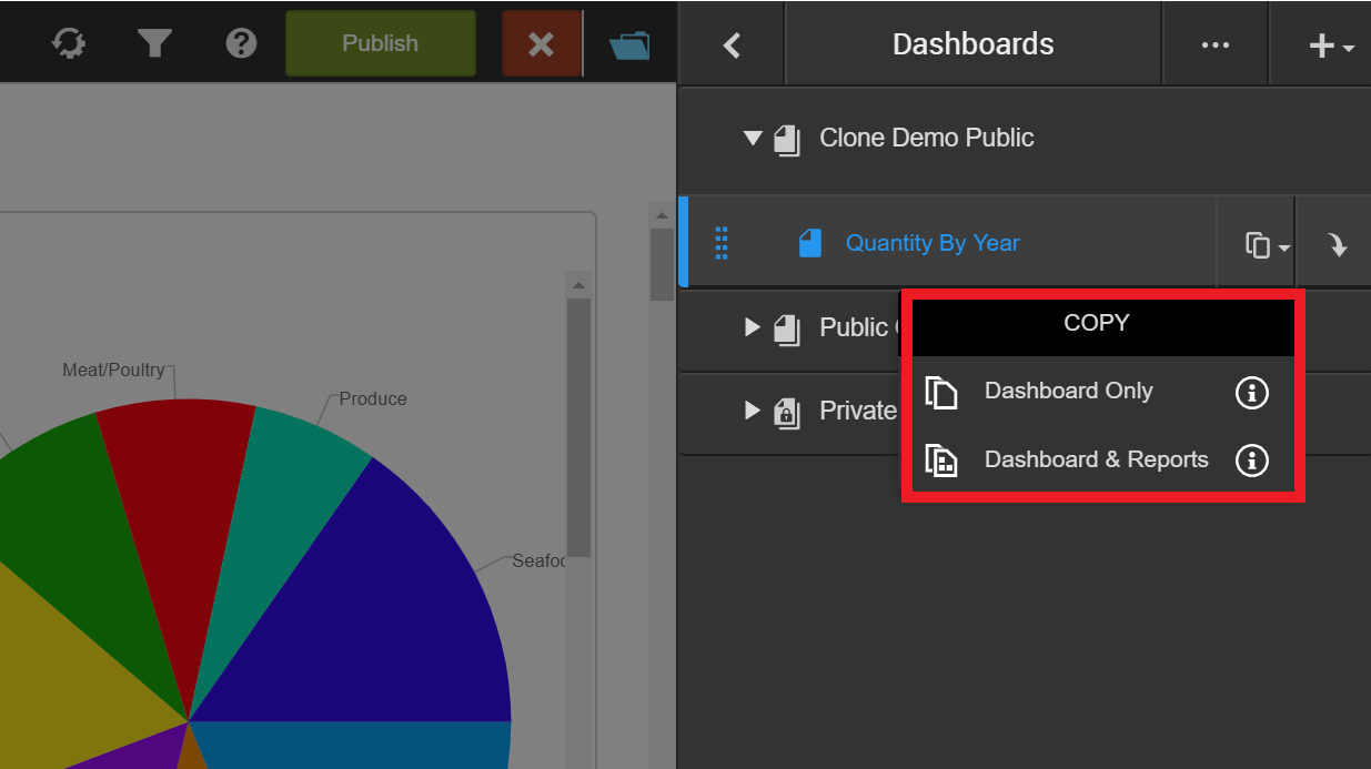 From the Collection Manager, users can copy dashboards. There are two options for copying a dashboard: Dashboard Only and Dashboard & Reports.