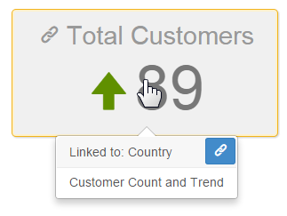 The KPI shows a link indicator so that the user knows to click and drill. Resting your cursor over a KPI reveals the linked page name and description, if any.
