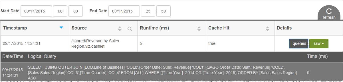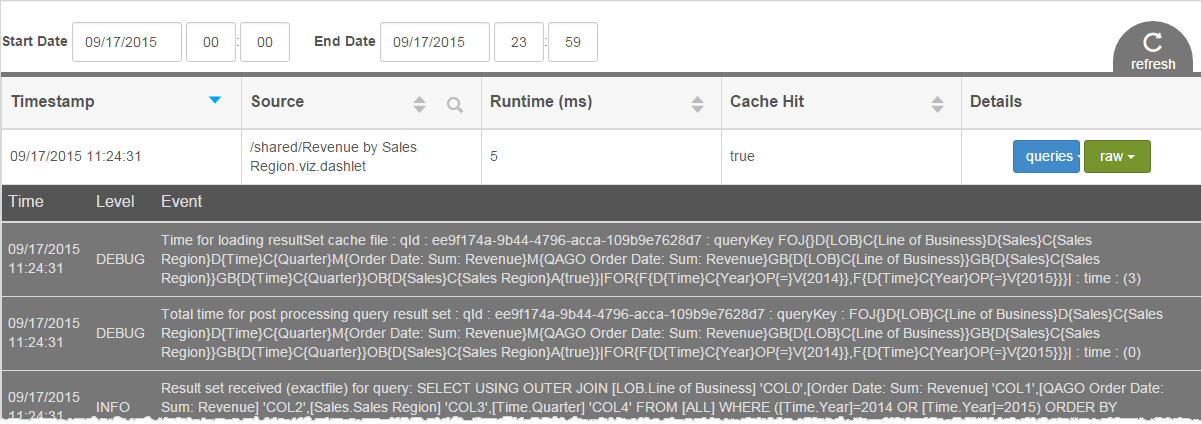 Viewing BQL query and raw logs To view BQL Query logs, click queries. To view raw logs, click the raw and the DEBUG and INFO level logs display.