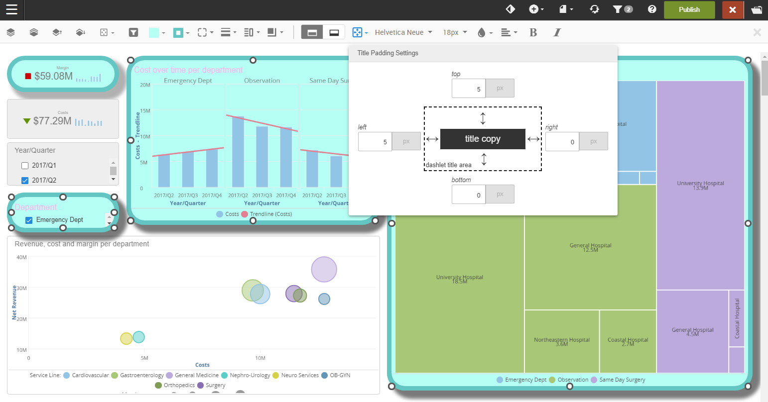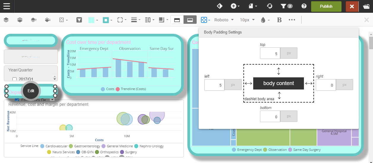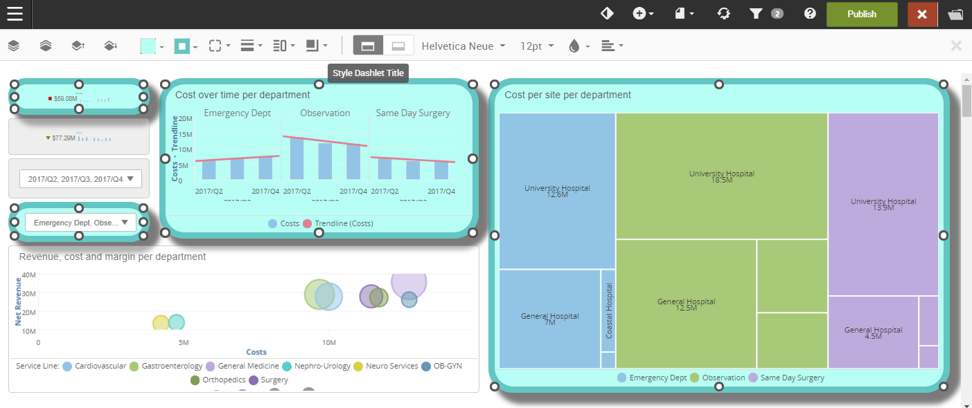 The dashlet style options become available when you select one or more dashlets. To select multiple dashlets, hold the Ctrl (PC) or Command (Mac) key and select the dashlets.