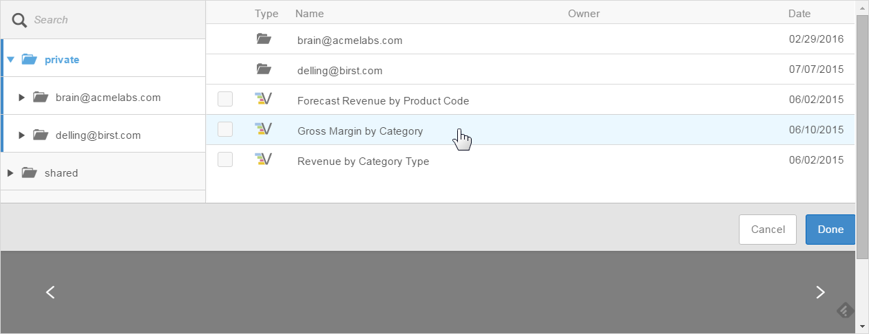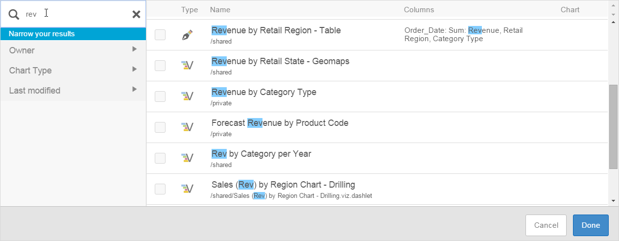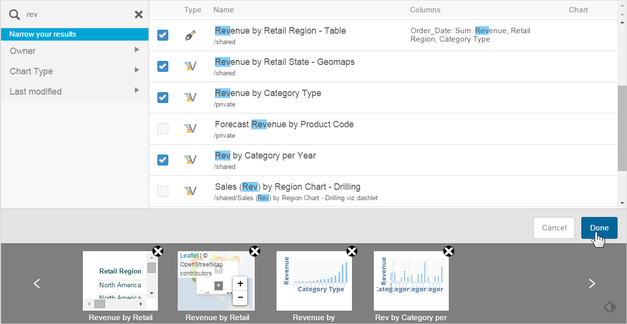 Note: Use the Search parameters to narrow down the list of reports by creator, type, and modification date. - To add more than one report to the dashboard, select multiple reports from the Report List. As you add the reports, their thumbnails are added to the bottom of the list.