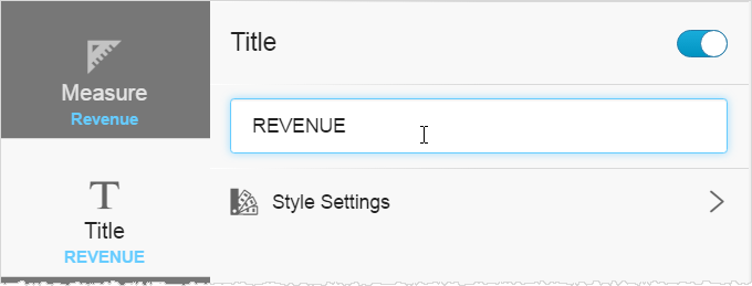 Renaming KPI dashlet titles Click the Title block to specify a different title. Optionally, you can toggle the title off so it does not display. Note: You can use variables, with either the GetVariable('variable_name') or V{variable_name} syntax, in the title. Click Style Settings to change the title font color. As with the measure, you can enter a hex value for the color.