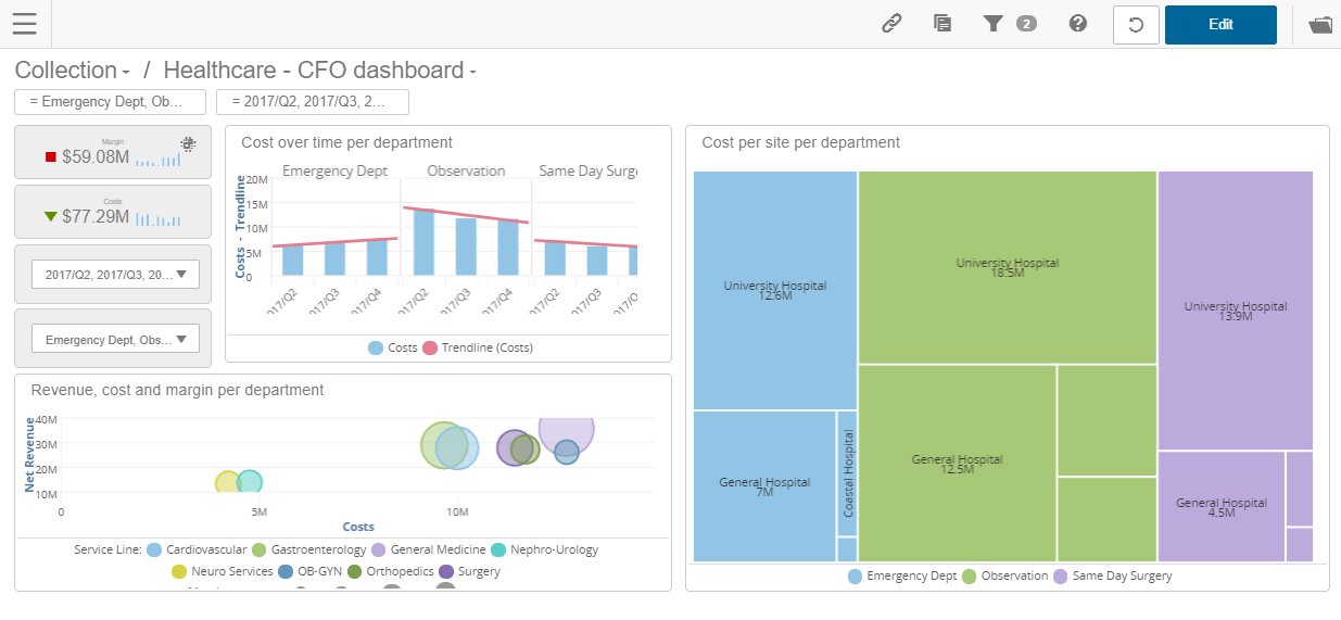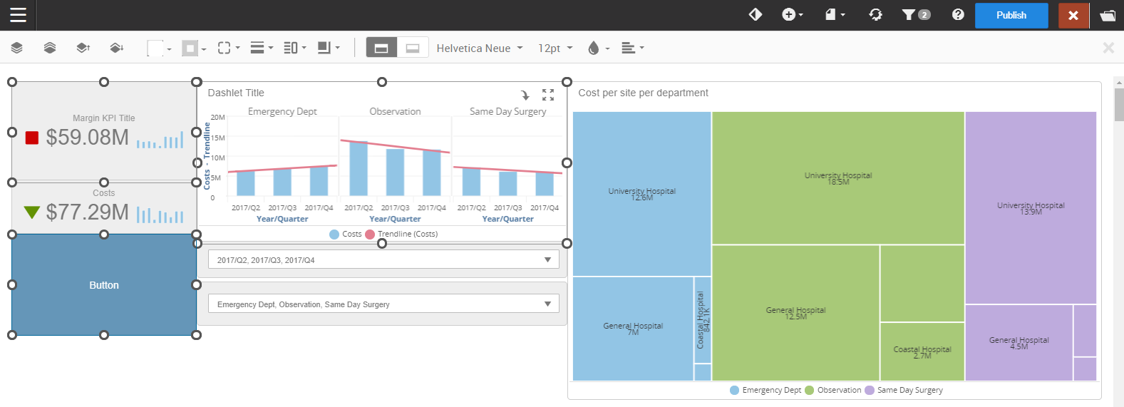 The Edit Toolbar appears after selecting an item on the dashboard. The available options on the edit toolbar depend on the selected items. Dashlets and KPIs, have additional unique options that are only available when they are selected.