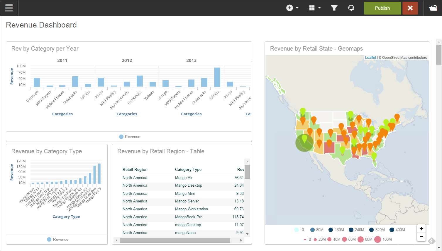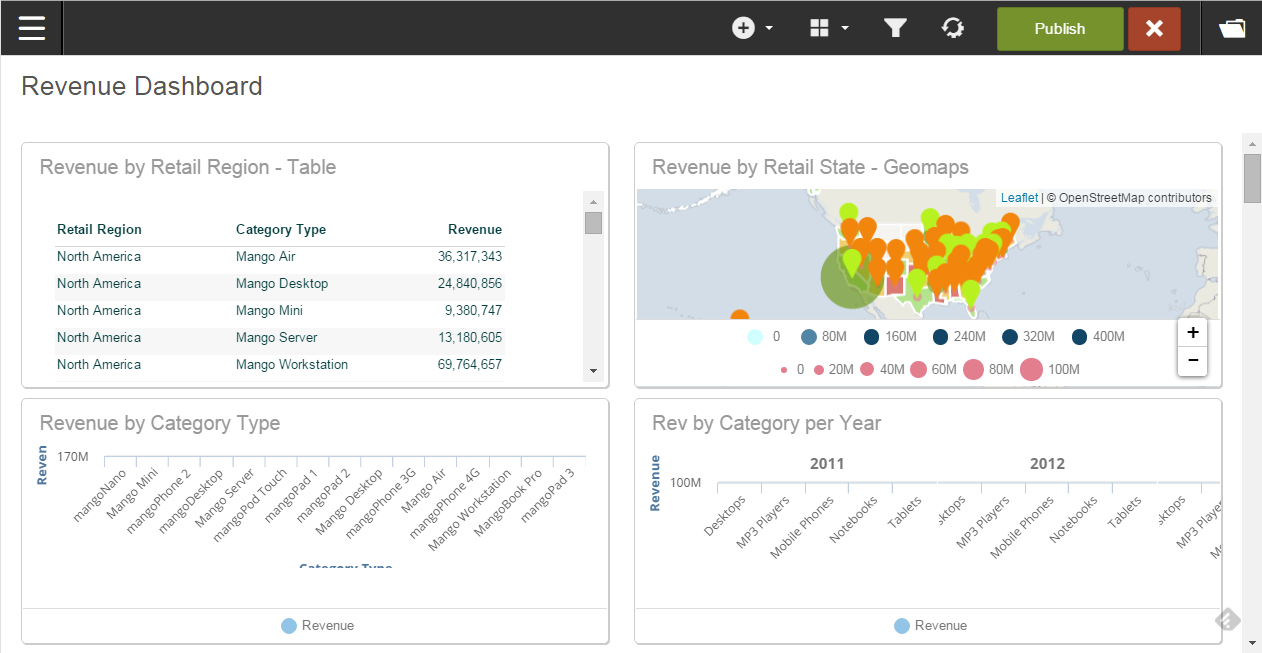 Applying automatic layouts You can drag-and-drop reports as you like. Optionally you can use the automatic layout menu. Click Dashboard Design, and then select Layout. Select the column layout from the Layout menu to automatically position them on the grid. You can also drag the columns to how you want them. Select the dashlets and move or resize as needed. As you resize the browser, the reports in the dashlets resize. Click Publish to save the dashboard. Related topics Organizing the dashboard layout