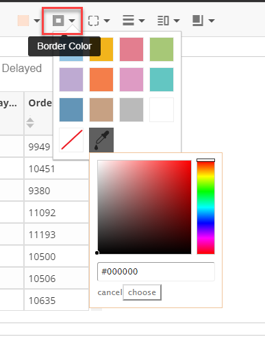 - You can use the dashboard style bar to display or hide the border and change the color of the border stroke. Similar to the background color, you can customize the color using the dropper or enter a hex value for the border color. If you desire no border, select the red slash option.