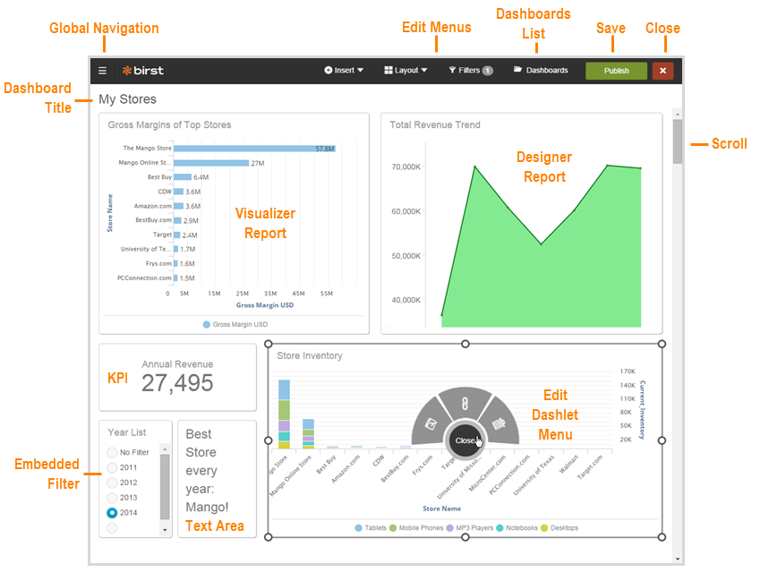 Dashboards have pages that display dashlets and each dashlet holds a report from either Designer or Visualizer. Plus, you can create key performance indicator (KPI) dashlets directly in Dashboards.
