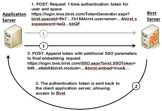 Embedding requires using Birst single sign-on (SSO). Birst uses a standard 3-step SSO handshake, also called a 2-pass SSO handshake. This diagram shows how authentication mechanism provides access to Birst.
