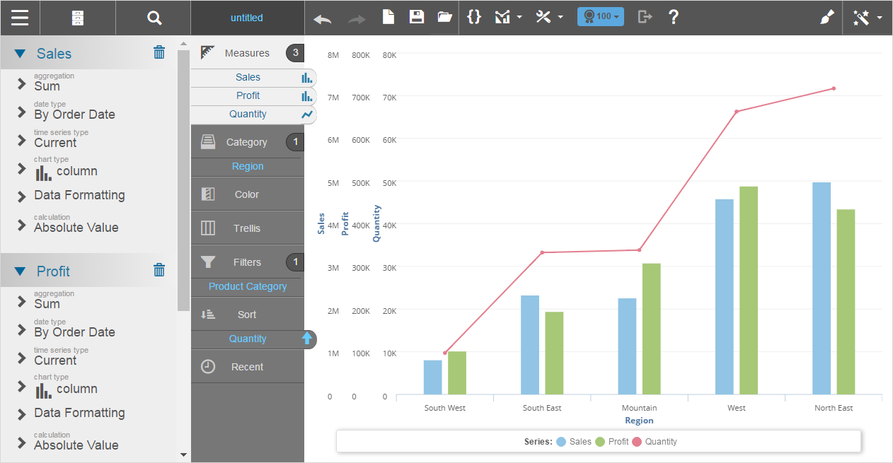 Visualizer helps business users and report writers to rapidly answer questions and discover information. You don't have to have formal expertise to interact with the drop-down menus and drag-and-drop columns. You can save and add reports to dashboards.