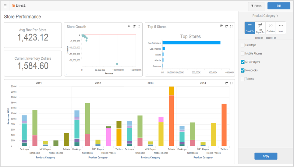 Birst Dashboards are based on responsive design principals and promotes highly interactive user experiences. Organize Visualizer and Designer reports onto dashboards, add powerful filters, key performance indicators (KPIs), geo maps, and text boxes, and group dashboards into collections.