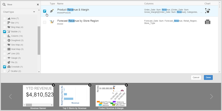 After you create reports in Designer or Visualizer, you can build dashboards to display the reports.