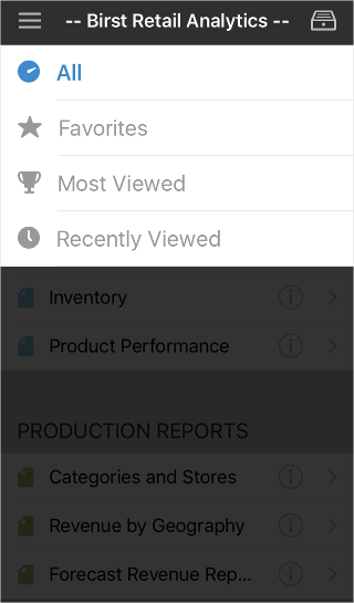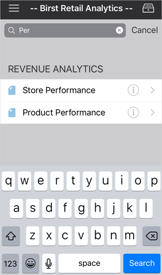 In Search, specify a partial name of a report. Name matches are immediately displayed and you can tap to select the one you want to view.