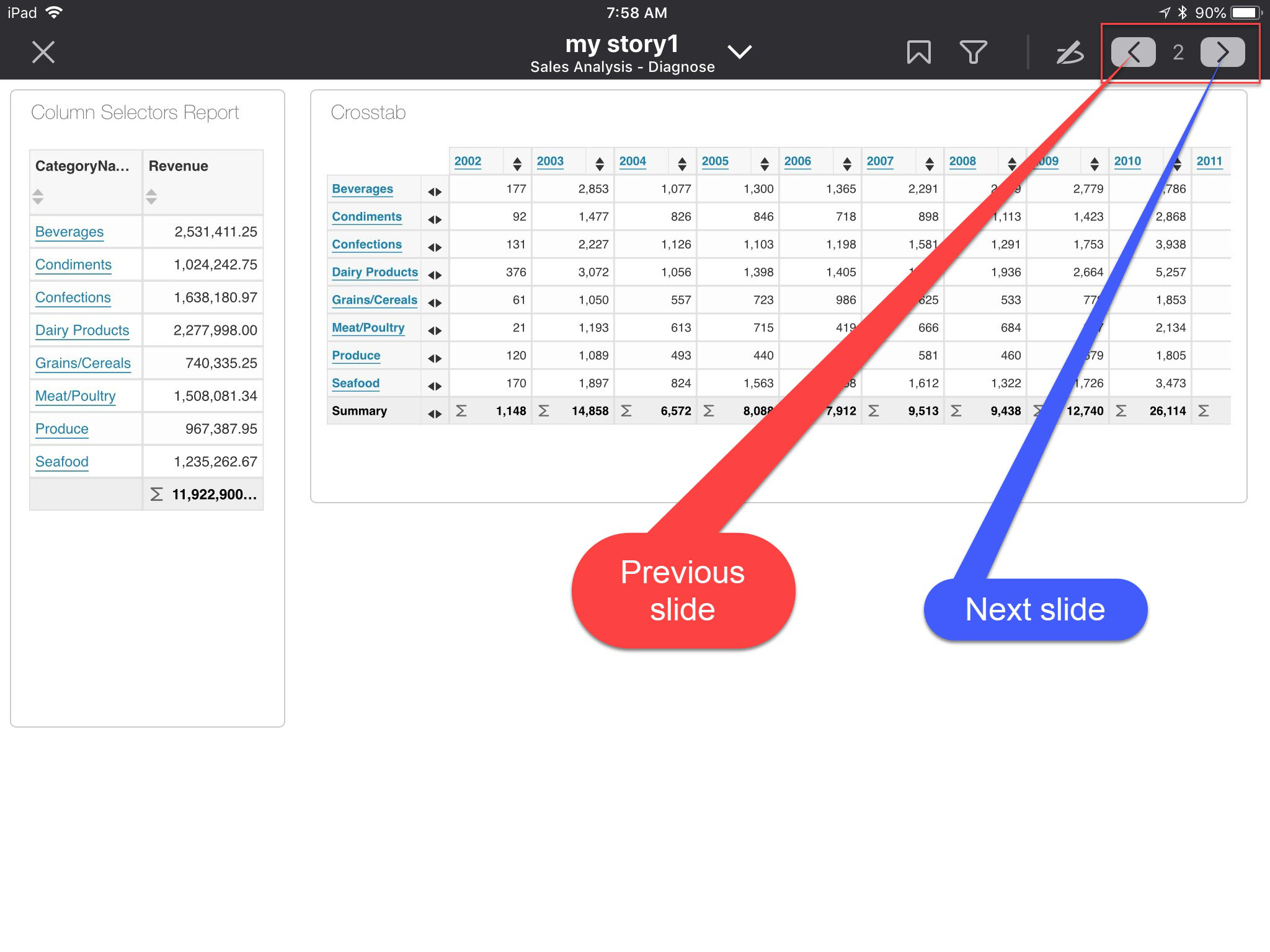 - Change slides by taping the previous and next buttons, selecting the title button to display values, or by two finger swiping forwards and backwards.