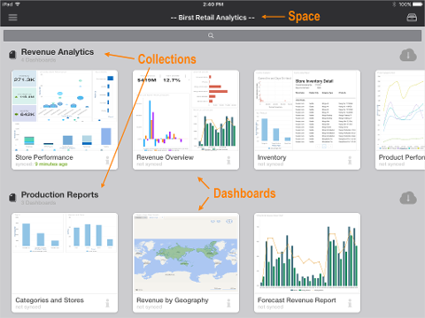 How are dashboards and reports organized on an iPad?