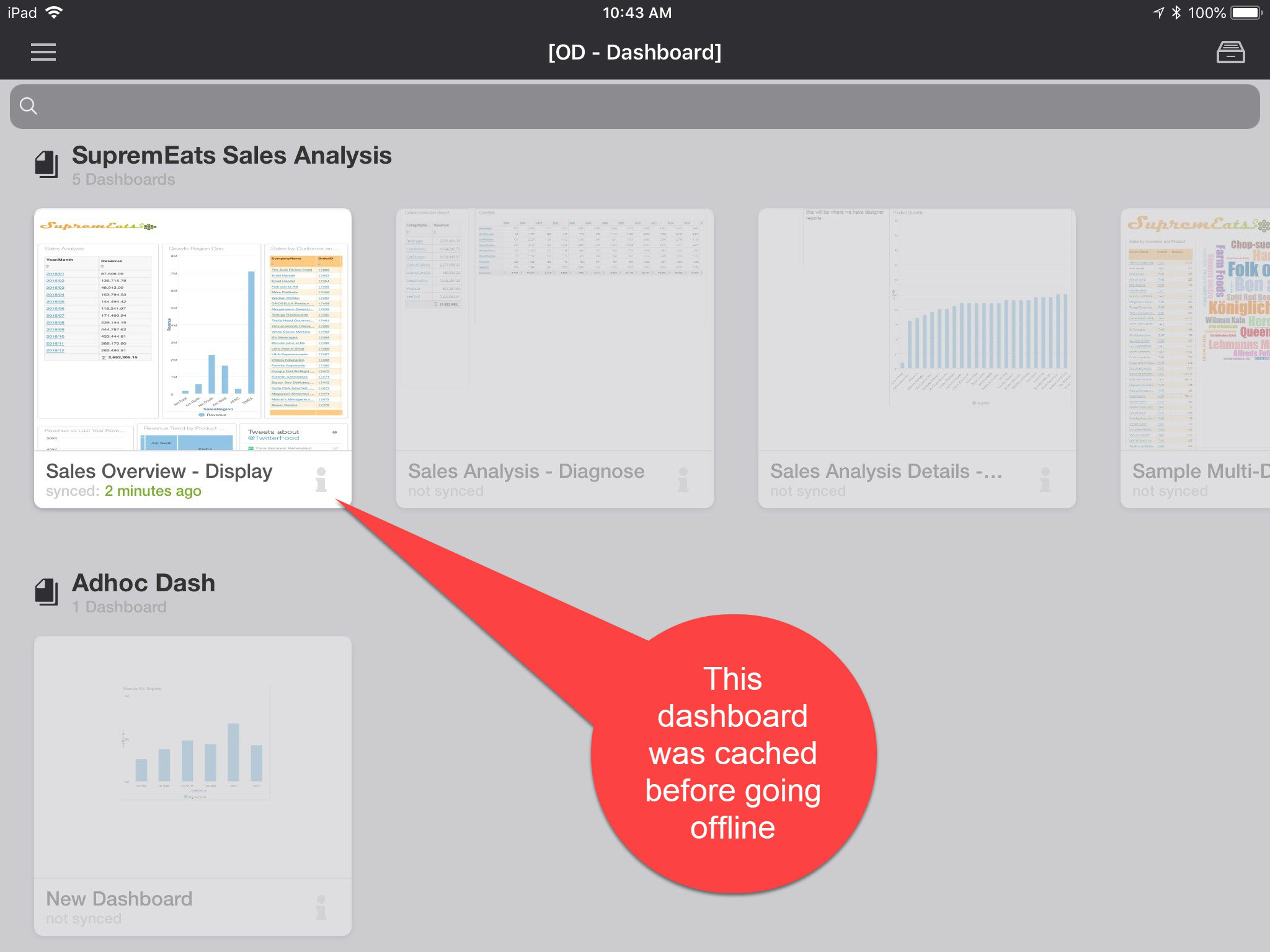 After this initial setup, you are ready to go offline and can explore your data. Later, when the device is back online, go to the and tap . Any dashboards that you browsed while previously online will sync and refresh, showing a new last updated time.