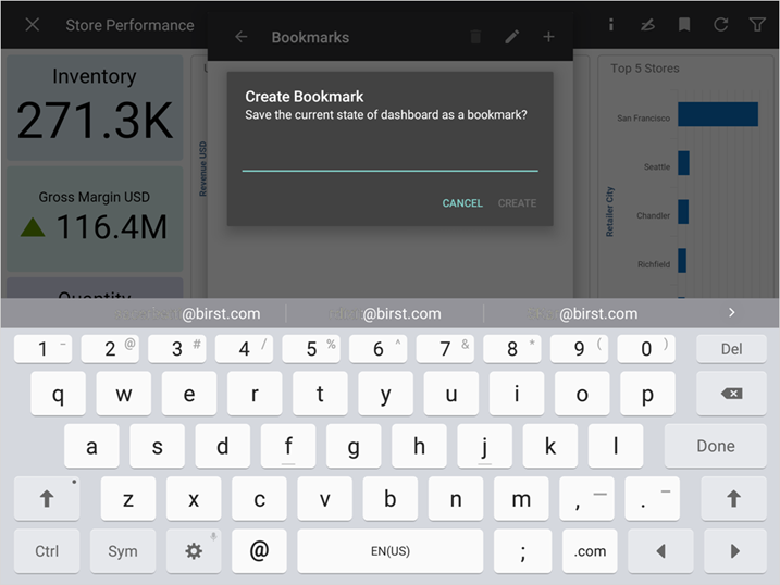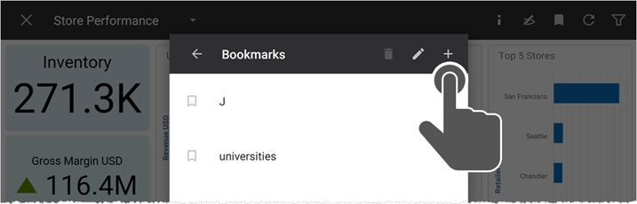 How do I set a bookmark on Android? Go to the dashboard view that you want to bookmark. Tap Bookmarks in the dashboard menu bar to open the bookmarks list. Tap Add (the + sign) to open the editor. Specify a name for the bookmark. Tap Create. Go to the list and tap the bookmark to reset the dashboard to the bookmarked state. Related topics Using Dashboards FAQs