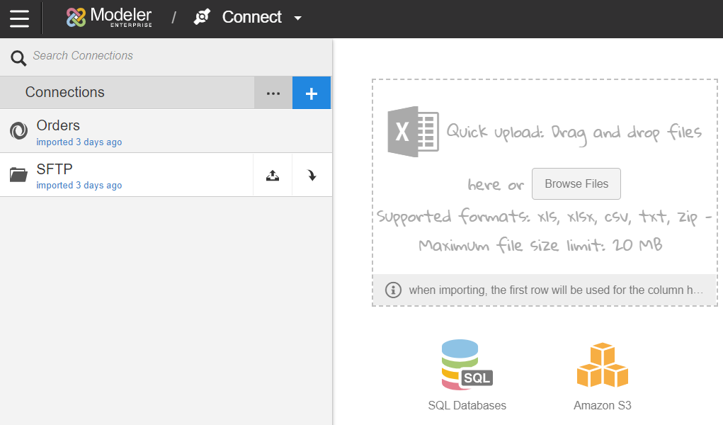 Configuring SFTP data sources Navigate to Modeler Connect. Select the SFTP connector from the Connector section or click the existing SFTP connection from the Connections panel. Click + Create New Object. Specify the Object Label to use for the source in Birst. Caution: Do not use the same name as an existing saved object from this or any other connector. It must be unique within a Birst space. Specify the File Name. For the SFTP Connector, the Object Label is not used as the data source name. Specify the File Path. Click Save. Birst adds it to the list of objects to be extracted in the Data Sources table. Click Import Connection Name Data to import the selected objects to Birst.