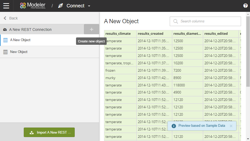 - From the connection, click +Create New Object.