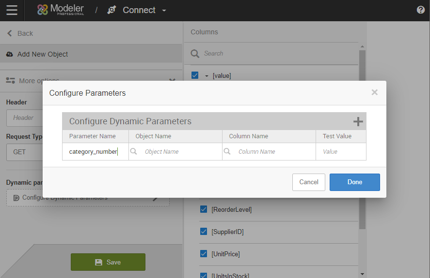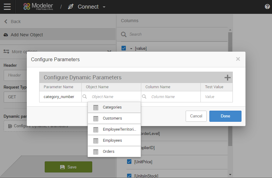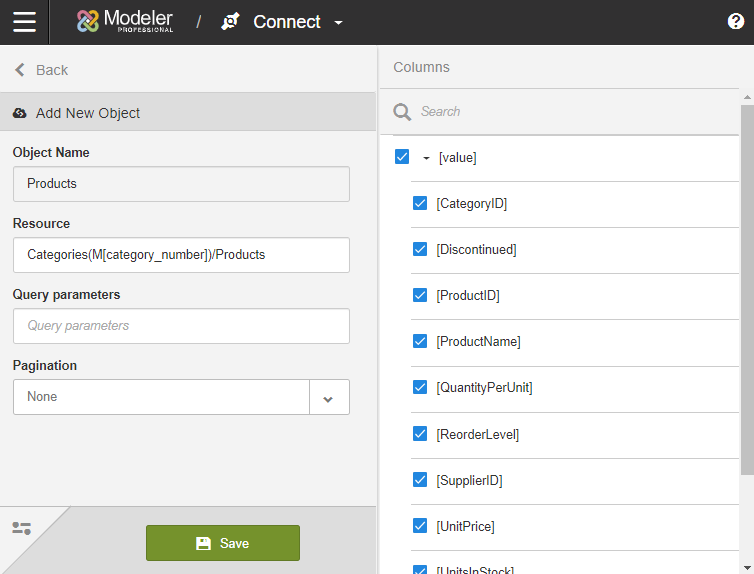 - Specify the Object Name. Pick from the list of sources in the REST connector.