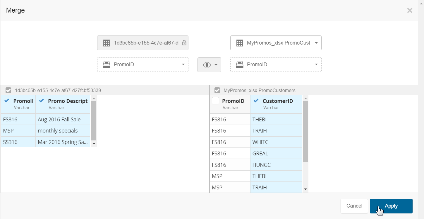 Using the same process as before, select the MyPromos_xlsx MyPromos and MyPromos_xlsx PromoCustomers sources, and merge them using the PromoID field as the inner join. Do not forget to hide the second PromoID column.