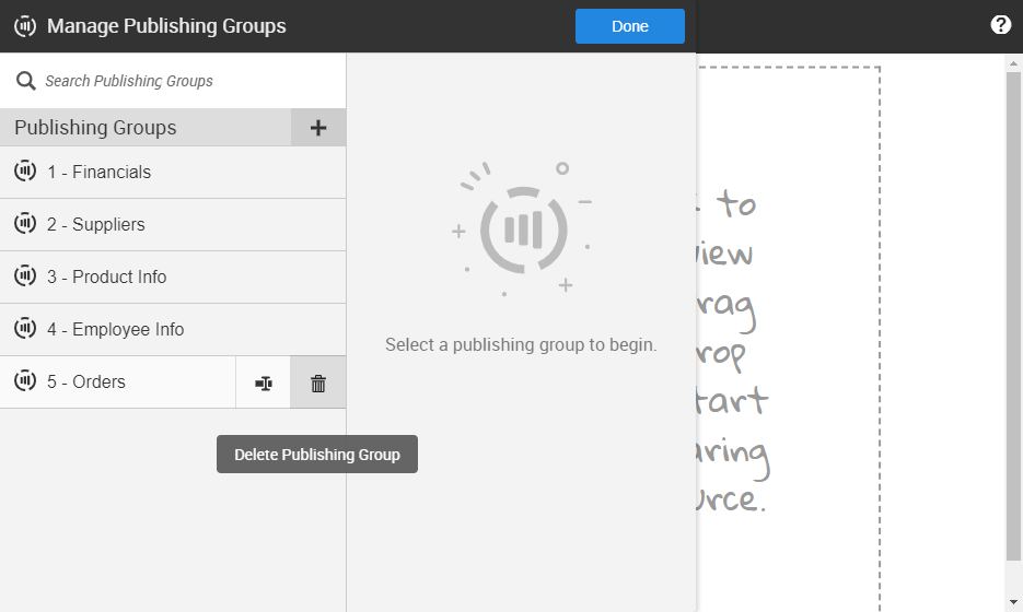 Note: Deleting a publishing group is permanent and this action cannot be undone. Remove any tasks in Orchestration that use this publishing group before deleting.