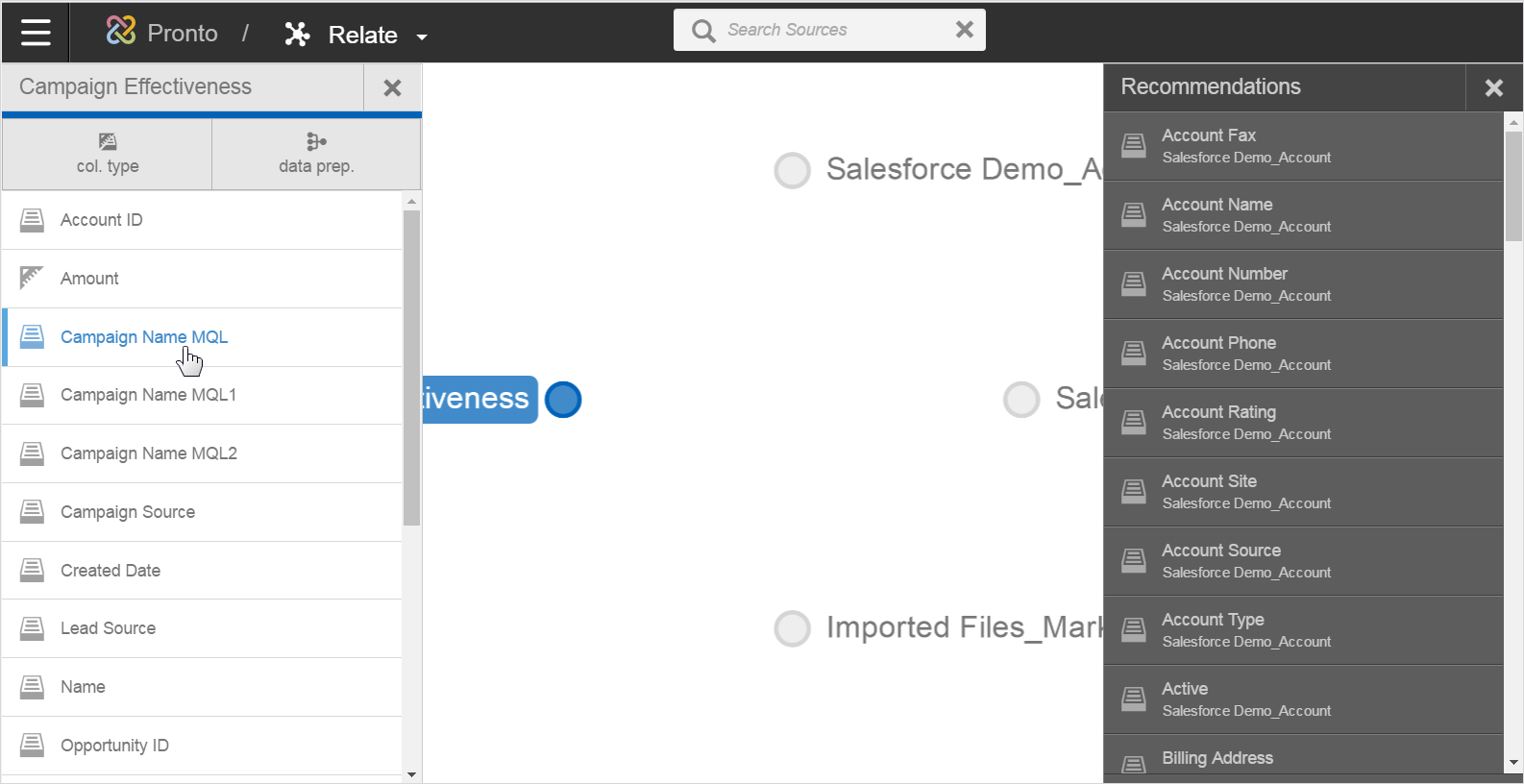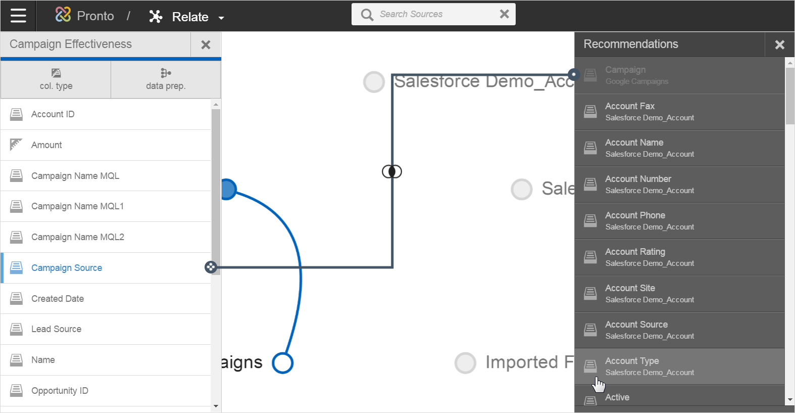 When you click on a column on the left, Modeler gives suggestions for possible joins on the right. These suggestions are based on data types and not on the actual data in the columns. If you select one that doesn't match, Modeler warns you and you can delete it.