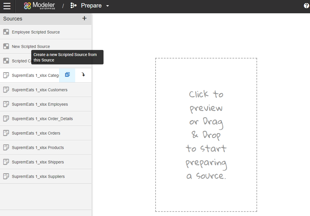 - Select your raw source, and then click the + icon on that source to create a new scripted source from that raw source.