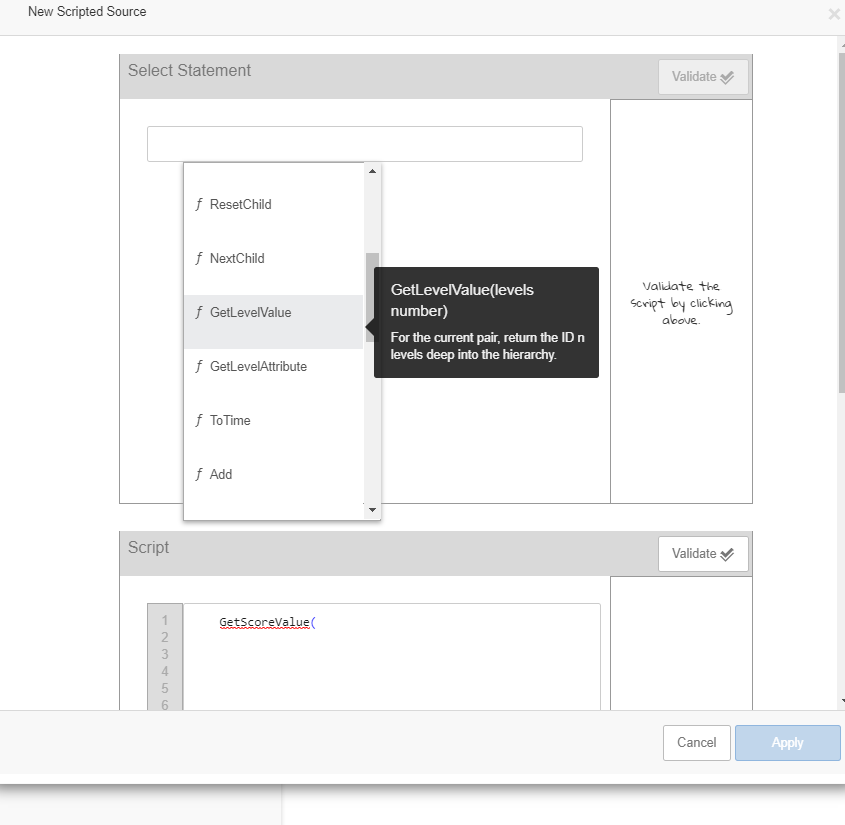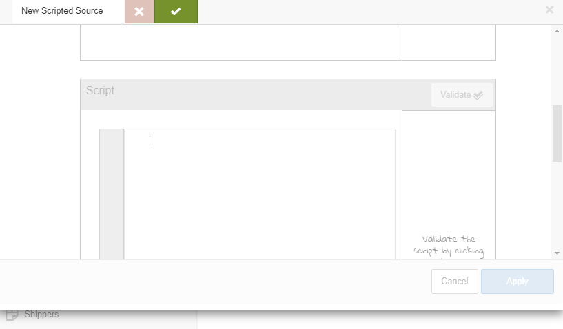 - The script code for the scripted data source. Click Validate to validate the script.